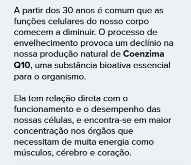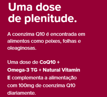 Fórmula desenvolvida para suplementar de uma maneira eficiente a coenzima Q10, uma substância que tem relação direta com o bom funcionamento e desempenho das nossas células, e encontra-se em maior concentração nos órgãos que necessitam de muita energia, como músculos, cérebro e coração.