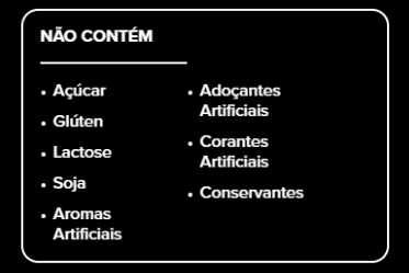 Cacau em pĂł*, proteĂna de fava hidrolisada* (PeptiStrongâą), sal, espessante goma gelana, aromas* naturais e idĂȘnticos aos naturais, edulcorante glicosĂdeos de esteviol de Stevia rebaudiana Bertoni (estĂ©via).